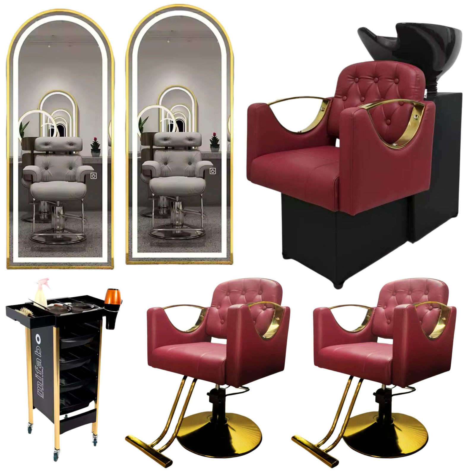 Transformă-ți salonul de coafor într-un spațiu de lux cu Pachetul Mobilier Coafor Roșu Bordo & Auriu, un set complet și elegant, conceput pentru saloane moderne, premium și orientate spre confortul clienților. Setul de mobila frizerie include toate piesele esențiale pentru zona de coafor și spălare – de la scafa profesională până la oglinzi LED impozante și ucenicul mobil pentru organizarea perfectă a ustensilelor. Fiecare piesă este selectată pentru durabilitate, funcționalitate și aspect impecabil, cu accente aurii și finisaje roșu-bordo, ideal pentru un decor sofisticat.