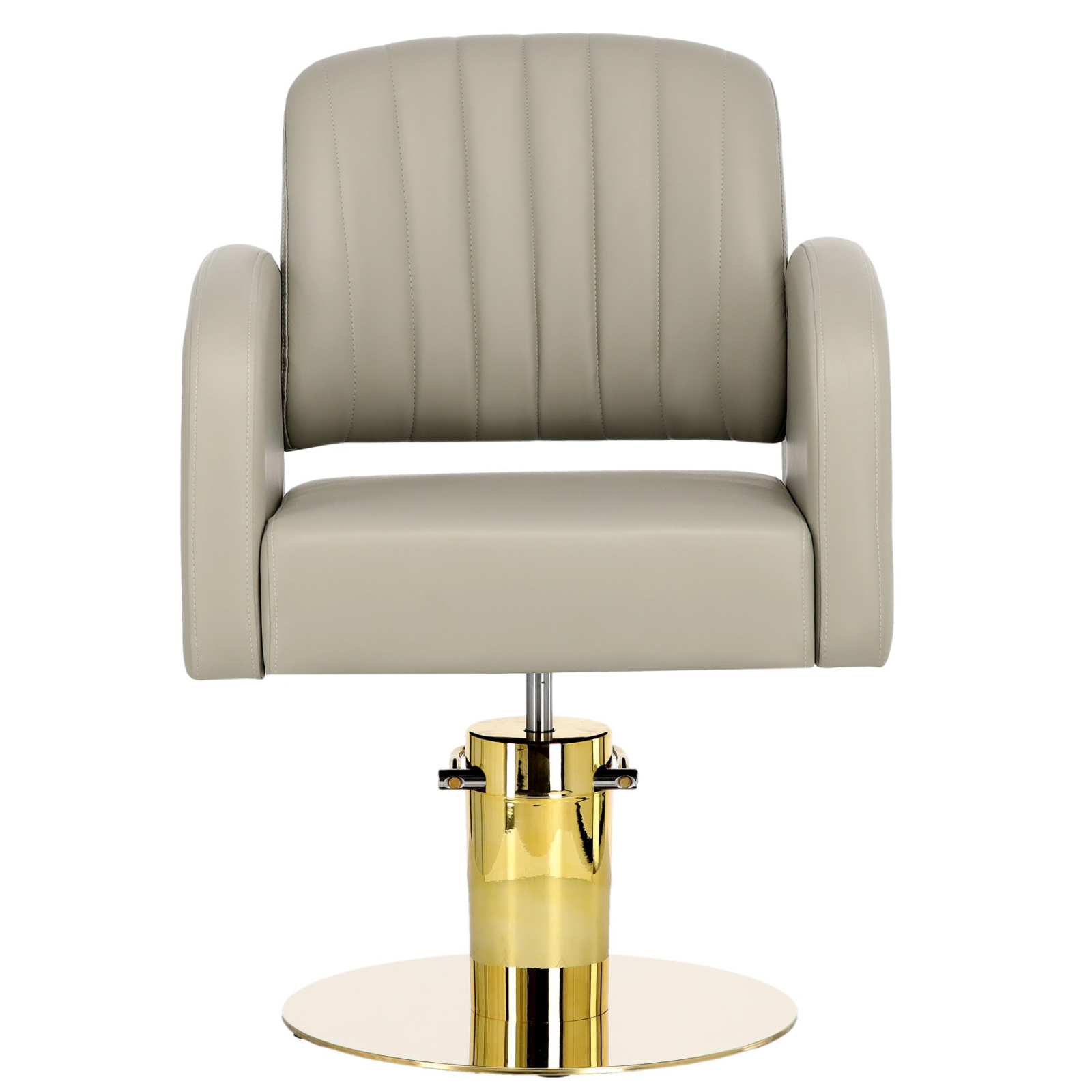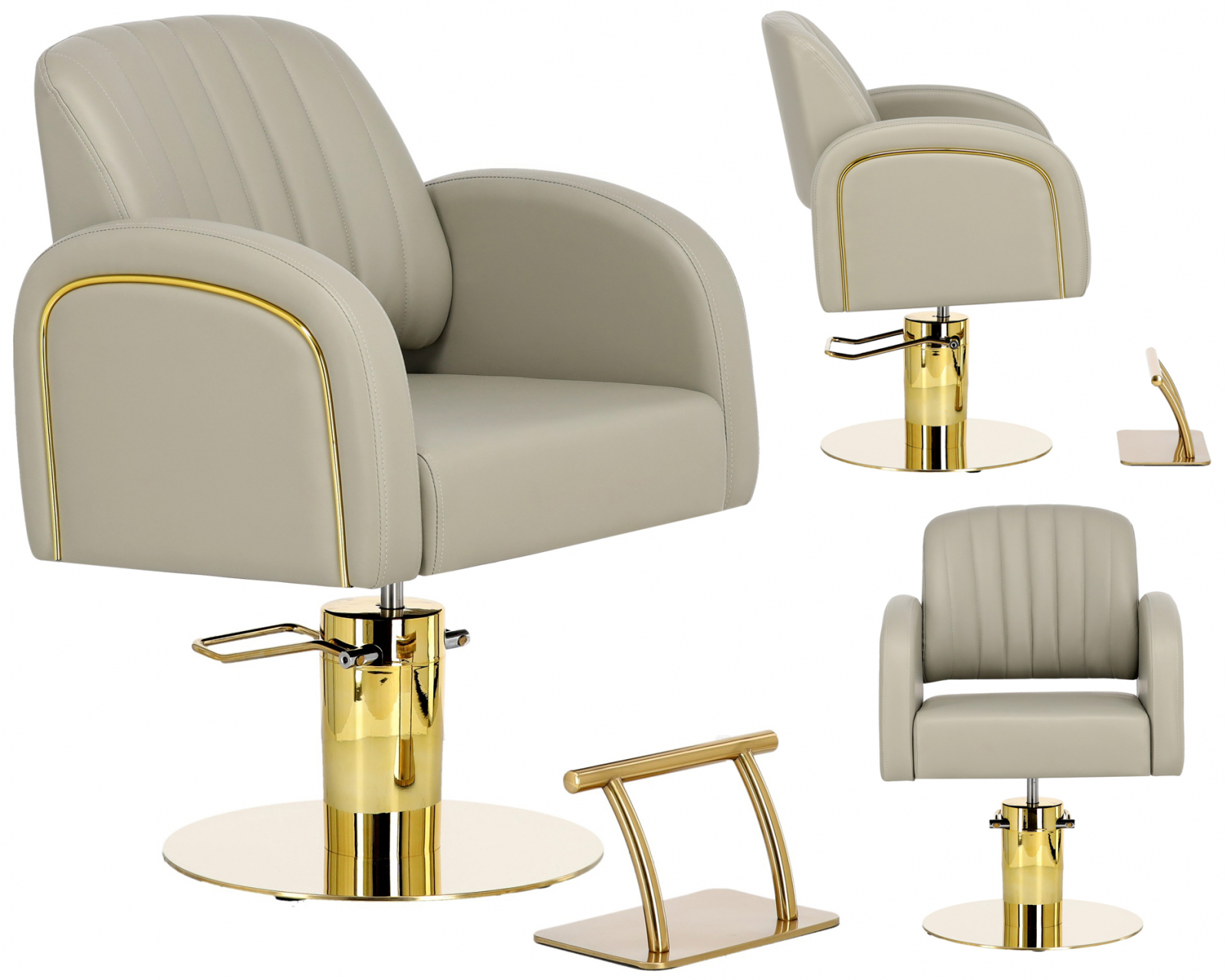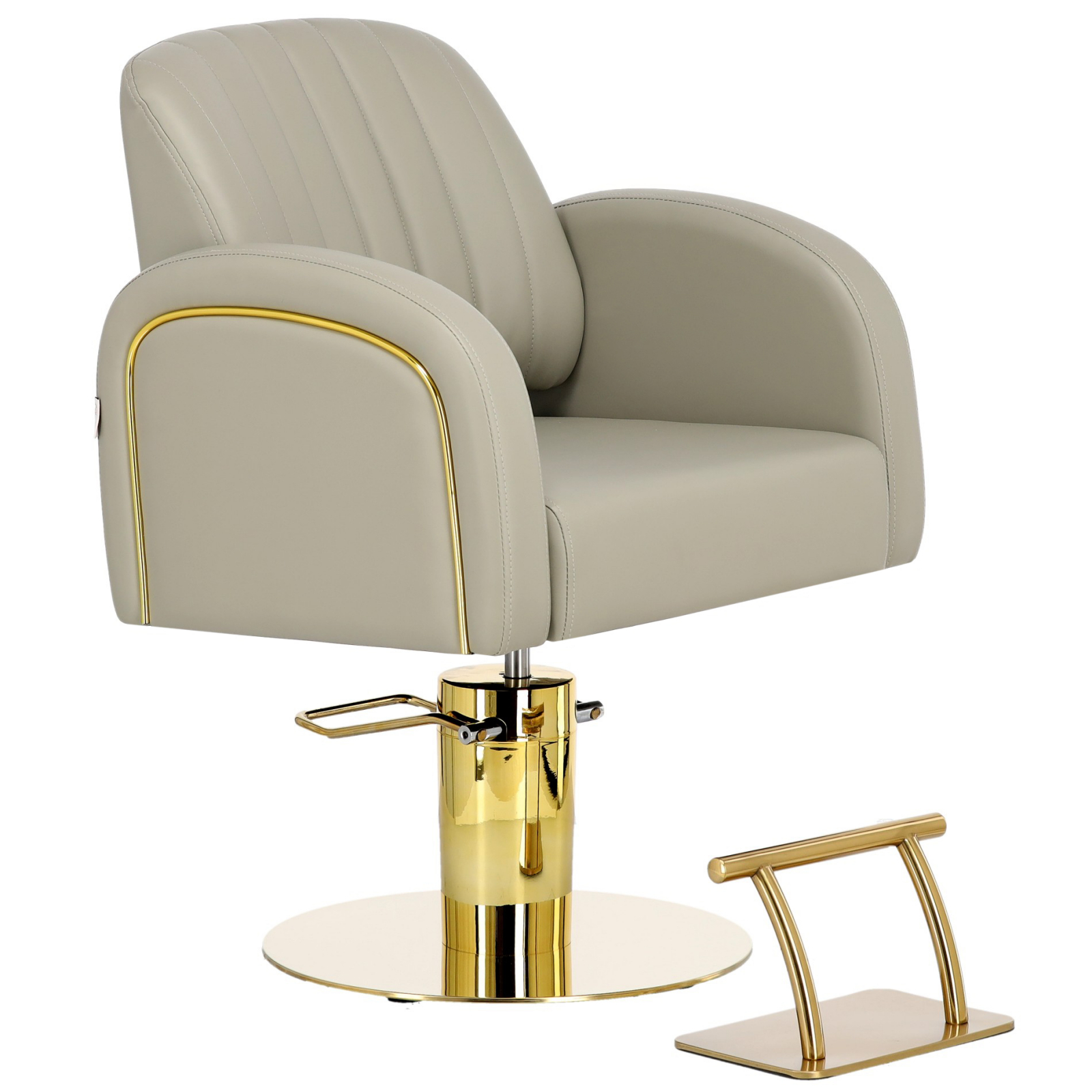Scaun Frizerie Luxos pentru Salon Coafor, Bej Gri cu Auriu, Hidraulic, cu Suport de Picioare, Reglabil pe Înălțime