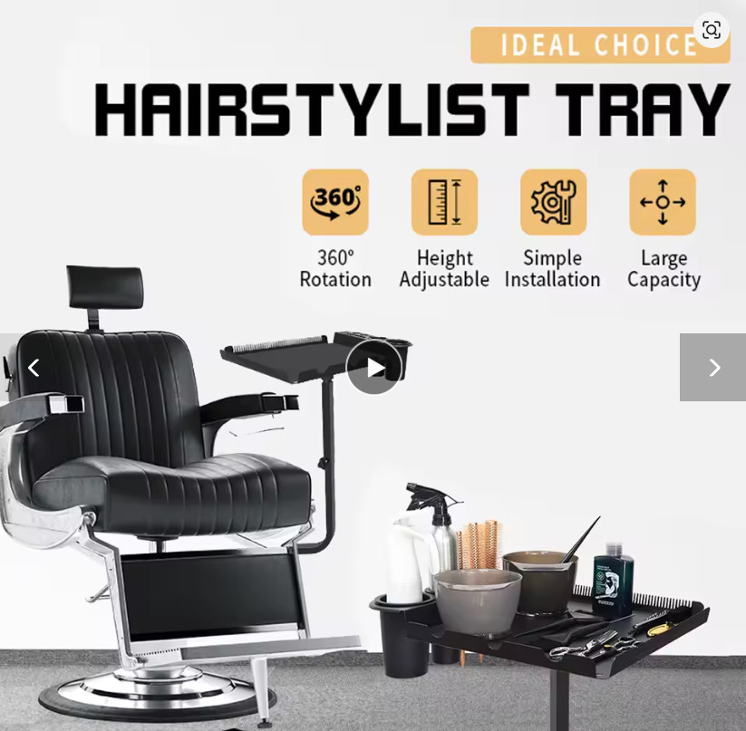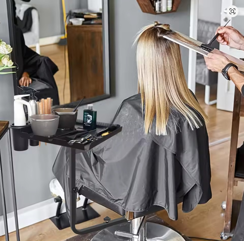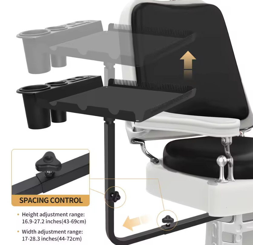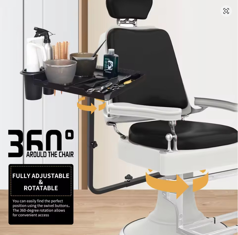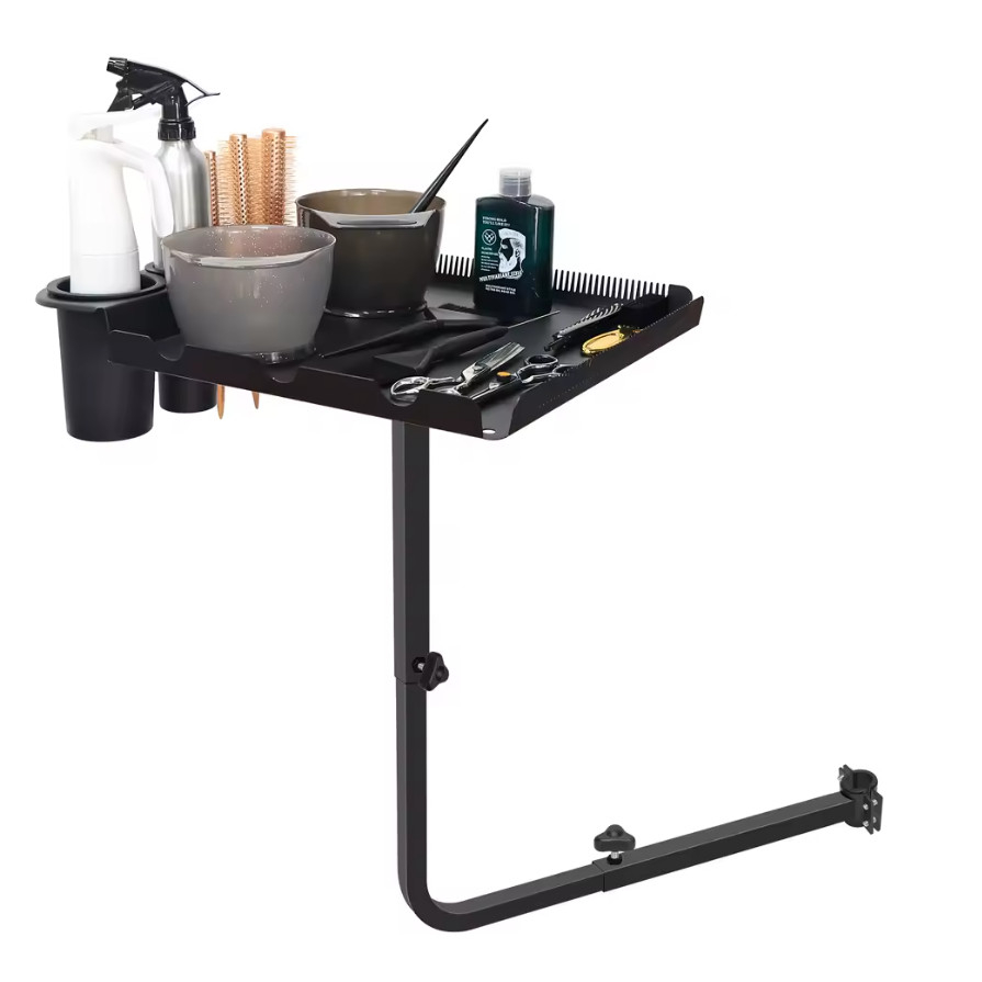 Fiind reglabilă pe înălțime, tava poate fi ajustată perfect în funcție de scaunul clientului și de poziția stilistului, reducând oboseala și îmbunătățind precizia. Se atașează ferm de laterala scaunului, oferind stabilitate și siguranță în timpul lucrului, fără să ocupe spațiu suplimentar pe blatul de lucru sau pe cărucioarele clasice.